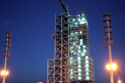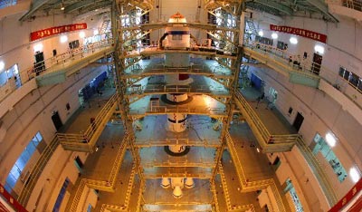 這是載人航天發(fā)射場運載火箭和“神舟”飛船垂直測試廠房內(nèi)景。神舟六號載人飛船將用長征二號F型火箭進(jìn)行發(fā)射。
