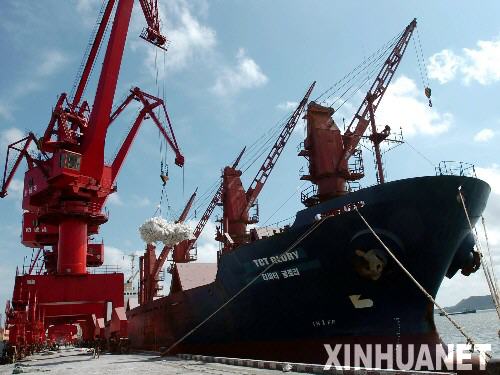 一艘外籍貨輪在防城港4號(hào)泊位卸貨(2007年7月24日攝)。2007年上半年,廣西北部灣經(jīng)濟(jì)區(qū)南寧、北海、欽州和防城港4市外貿(mào)進(jìn)出口總值達(dá)16.2億美元,比2006年同期增長36.6%。其中,廣西北部灣經(jīng)濟(jì)區(qū)對(duì)東盟進(jìn)出口額達(dá)5.5億美元,同比增長57.1%。