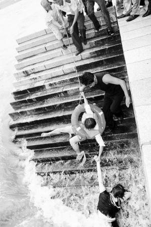 | 2005年8月,魏青剛套著救生圈在青島營救落水者。 |