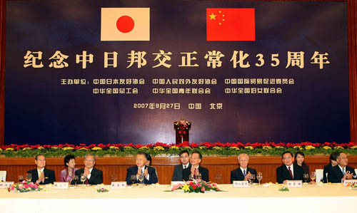 9月27日,國(guó)務(wù)院總理溫家寶與日本客人在北京人民大會(huì)堂共同出席紀(jì)念中日邦交正?;?5周年招待會(huì)。
