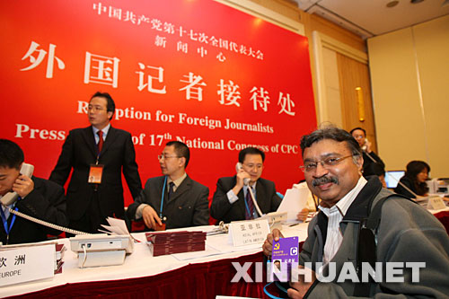 10月8日,印度報(bào)業(yè)托拉斯記者約瑟夫在新聞中心展示剛剛領(lǐng)到的記者證。當(dāng)日上午,中國(guó)共產(chǎn)黨第十七次全國(guó)代表大會(huì)新聞中心正式啟用,已對(duì)中外記者開放。