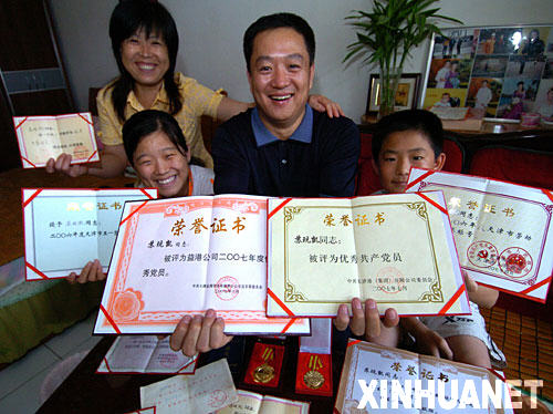 9月19日,蘇現(xiàn)凱(右二)展示他多年來獲得的優(yōu)秀共產(chǎn)黨員等榮譽證書。目前,蘇現(xiàn)凱把他的愛人也接到了天津,并在天津港找了一份保潔的工作,他的兩個孩子在天津市區(qū)上學。