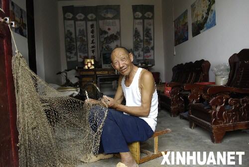 王家壩鎮(zhèn)保莊圩內(nèi)71歲的鄭洪堂老人在家里修補(bǔ)漁網(wǎng)(9月27日攝)。位于安徽省阜南縣的蒙洼蓄洪區(qū)是千里淮河第一蓄洪區(qū)。2003年淮河洪災(zāi),蒙洼蓄洪區(qū)曾緊急轉(zhuǎn)移受災(zāi)群眾近2萬人,家園變澤國、舉家遷移、帳篷連片的景象讓人難以忘懷。幾年來,國家投入資金、精心規(guī)劃,在蒙洼內(nèi)以鄉(xiāng)鎮(zhèn)為中心建立了4個(gè)保莊圩,并整修加固了136個(gè)四周有石頭護(hù)坡的莊臺(tái),將原來居住在蒙洼內(nèi)低洼區(qū)域的群眾全部轉(zhuǎn)移到安全地帶。2007年夏天,淮河流域發(fā)生了新中國成立以來僅次于1954年的流域性大洪水,蒙洼蓄洪區(qū)再次分洪。在此次洪災(zāi)中,國家修建的保莊圩和莊臺(tái)發(fā)揮了重要作用,居住在這里的群眾生活穩(wěn)定,告別了“水進(jìn)人退”的遷移之苦。