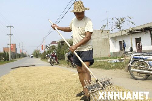 在王家壩鎮(zhèn)保莊圩內(nèi),一位農(nóng)民在晾曬剛收獲的稻谷(9月27日攝)。 新華社記者 李健 攝
