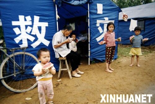 這是2003年7月蒙洼蓄洪區(qū)分洪后,當(dāng)?shù)厝罕娫谵D(zhuǎn)移安置點(diǎn)的帳篷里暫時(shí)居?。ㄙY料照片)。 新華社記者 李健 攝