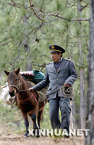 這是四川涼山彝族自治州木里藏族自治縣的馬班郵遞員王順友和他的棗紅馬(2005年1月12日攝)。以王順友為代表的馬班郵遞員幾十年如一日,冒著生命危險(xiǎn)跋涉在人跡罕至的高寒深山,為各族群眾送信送報(bào),確保全縣所有鄉(xiāng)鎮(zhèn)通郵。王順友就像高原上的一道脊梁,用無聲的力量實(shí)踐了自己心中一個(gè)樸素的信念:為黨和政府做事了不起,為人民做事了不起!