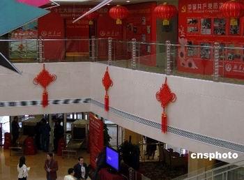 設立在北京梅地亞賓館的中共十七大新聞中心將于八日開始接待中外記者,中心的布置以紅色為底色,懸掛了多個大紅燈籠和中國結(jié),洋溢著喜慶的氣氛。中新社發(fā) 翁陽 攝