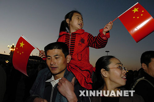 10月15日,北京天安門廣場(chǎng)舉行升國旗儀式。這是來自山東濟(jì)寧的王嘉鑫小朋友與家人一起觀看升旗儀式。當(dāng)日上午,中國共產(chǎn)黨第十七次全國代表大會(huì)將在北京人民大會(huì)堂開幕。新華社記者 楊俊江 攝