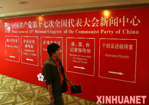 10月6日,一名工作人員從十七大新聞中心內(nèi)的指示牌前走過。 新華社記者 李濤 攝