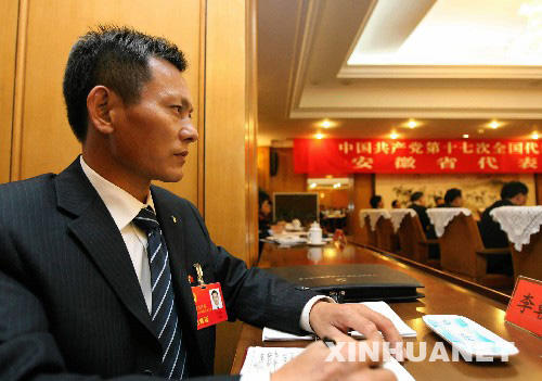 10月15日下午,出席十七大的各代表團圍繞胡錦濤同志向大會所作的報告進行了分組討論。這是十七大代表、安徽建工集團三建公司高級技師李朝進在聽取代表們的發(fā)言。 新華社記者 劉衛(wèi)兵攝