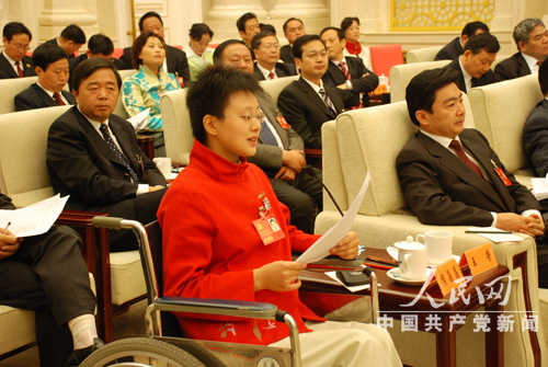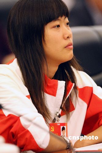 十七大10月16日下午繼續(xù)舉行分組會,討論胡錦濤總書記的報告。本屆大會最年輕的代表、23歲的奧運女子佩劍個人亞軍譚雪出席天津代表團的討論會。中新社發(fā)任晨鳴 攝