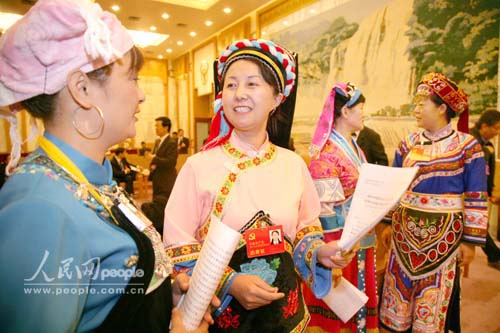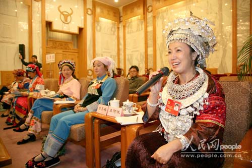 10月16日,在代表團小組分會上,貴州省代表團石東梅代表(左一)、楊霞代表(左二)正就如何保護和發(fā)展民族文化,促進民族文化和諧建設,推動社會主義文化大發(fā)展大繁榮展開討論。(雷聲/攝)