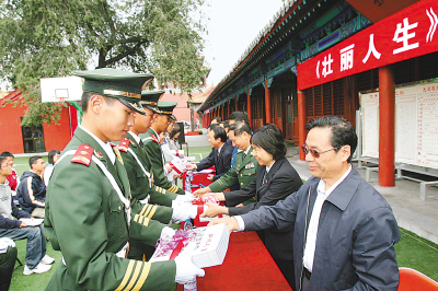 中宣部宣教局組織編寫(xiě)的《壯麗人生》大型畫(huà)冊(cè)由學(xué)習(xí)出版社出版。畫(huà)冊(cè)收入了黨的十六大以來(lái)集中宣傳的30位全國(guó)重大先進(jìn)典型。圖為今年10月10日,中宣部的同志向國(guó)旗護(hù)衛(wèi)隊(duì)贈(zèng)送《壯麗人生》畫(huà)冊(cè)。新華社記者 李濤 攝