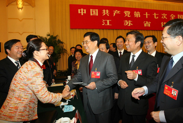 10月16日,胡錦濤同江蘇代表團(tuán)代表一起審議黨的十七大報(bào)告。這是胡錦濤同來自基層的代表親切交談。新華社記者樊如鈞攝