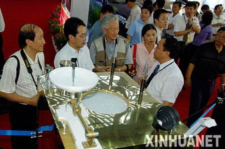10月13日,幾名前來參觀的專業(yè)人員在“嫦娥一號”人造月球衛(wèi)星模型前交談。 新華社記者 周文杰 攝