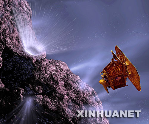 2005年7月4日,美國(guó)宇航局“深度撞擊”號(hào)探測(cè)器釋放的撞擊器擊中目標(biāo)――坦普爾1號(hào)彗星,創(chuàng)造了人造航天器和彗星的“第一次親密接觸”。這是美國(guó)國(guó)家宇航局對(duì)外公布的模擬圖片:“深度撞擊”號(hào)發(fā)射的撞擊艙在“親吻”坦普爾一號(hào)彗星表面后引起了爆炸(畫面左上方)。 新華社發(fā)