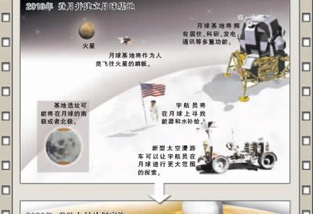 阿波羅探月計劃結(jié)束30多年后,美國總統(tǒng)布什在2004年初提出了“太空探索遠景計劃”(Vision forSpaceExploration)———2018年,人類將再次登上月球,并建立月球基地;從2020年開始著手為人類登上火星做準備。今年8月,美國宇航局將正式公布一份以此為基礎的太空探索計劃,詳細描繪出人類重上月球的具體方案。