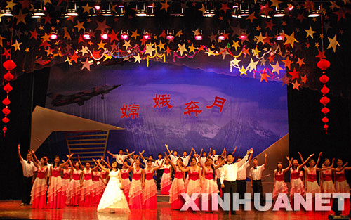 10月24日,南昌航空大學(xué)學(xué)生在表演合唱。當(dāng)日,搭載著我國(guó)首顆探月衛(wèi)星嫦娥一號(hào)的長(zhǎng)征三號(hào)甲運(yùn)載火箭在西昌衛(wèi)星發(fā)射中心三號(hào)塔架點(diǎn)火發(fā)射。來(lái)自南昌航空大學(xué)的千余名師生集體觀看衛(wèi)星發(fā)射升空的直播,并和一些青年演員一起舉辦“嫦娥奔月”公益演唱會(huì),表達(dá)對(duì)此次探月之旅的祝福。新華社記者宋振平攝