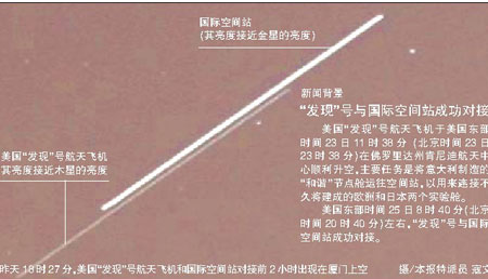 昨天(10月25日)18時27分,美國“發(fā)現(xiàn)”號航天飛機和國際空間站對接前2小時出現(xiàn)在廈門上空