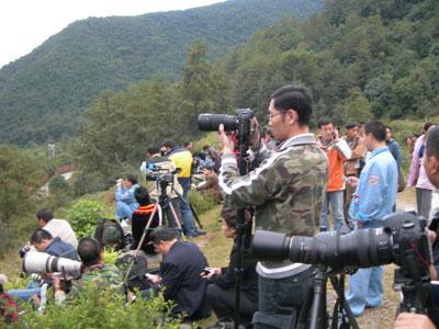 今天(24日)下午六點(diǎn)零五分,我坐在西昌發(fā)射中心的山坡上,腳下是一片自由生長的小野花,抬眼800米外就聳立著“長征三號(hào)甲”火箭,周圍是一群和我一樣心跳越來越快的伙伴。大家舉著相機(jī),不管是傻瓜機(jī),還是專業(yè)機(jī),一律瞪著那個(gè)潔白耀眼的目標(biāo)。“哇,好激動(dòng)啊!”來自北航的林媛開始興奮地嚷道。