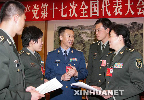 10月17日,出席十七大的解放軍代表熱烈討論胡錦濤同志向大會作的報告,表示要把貫徹十七大精神作為當(dāng)前和今后一個時期全軍的首要政治任務(wù),努力在新的起點上推進(jìn)軍隊建設(shè)科學(xué)發(fā)展,全面履行黨和人民賦予的新世紀(jì)新階段我軍歷史使命。這是來自部隊的英模和基層代表展開討論。新華社記者王建民攝