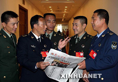 10月17日,出席十七大的解放軍代表熱烈討論胡錦濤同志向大會作的報告,表示要把貫徹十七大精神作為當(dāng)前和今后一個時期全軍的首要政治任務(wù),努力在新的起點上推進(jìn)軍隊建設(shè)科學(xué)發(fā)展,全面履行黨和人民賦予的新世紀(jì)新階段我軍歷史使命。作為基層的戰(zhàn)士黨員代表能參加黨的全國代表大會,士官朱桂全(左二)、宗道輝(左三)、陳列周(左四)、張新員(右一)心情激動。連日來,他們認(rèn)真學(xué)習(xí)討論報告,決心以實際行動報答黨和人民的殷切期望。新華社記者王建民攝