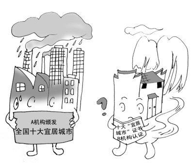 爭議之二,評選結果頻頻鬧出“烏龍”事件。最典型的例子是2005年,重慶市剛被某商業(yè)機構高調評為“中國十大宜居城市”沒幾天,環(huán)??偩志统鼍邎蟾?,認定重慶屬于“十大污染城市”之列。