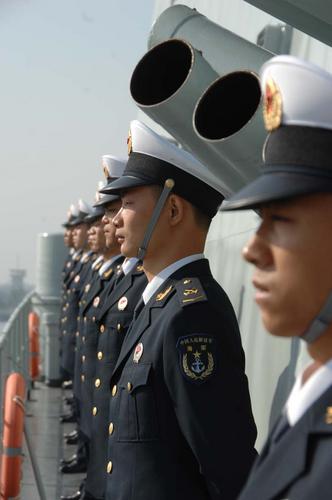 2007年11月21日上午,廣東湛江,出訪日本海軍官兵在167艦甲板站坡準(zhǔn)備起航。圖片來源:CFP