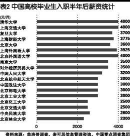 而在高校畢業(yè)生月收入期望值中,北京市社會(huì)科學(xué)院和社科文獻(xiàn)出版社2007年年初發(fā)布的《2007年中國(guó)首都社會(huì)發(fā)展報(bào)告》也顯示,北京大學(xué)、清華大學(xué)畢業(yè)生月收入期望值最高,在5000元以上;北京師范大學(xué)在3000~4999元左右;北京科技大學(xué)在2000~2999元內(nèi);北京交通大學(xué)、北方工業(yè)大學(xué)等在1000~1999元左右(見表2)。