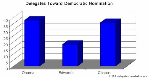 盡管民主黨人最近在密歇根州舉行了一次初選,但由于該州違反黨規(guī),該州的選舉代表名額被取消。民主黨參選人的競(jìng)爭(zhēng)將繼續(xù)是巴拉克·奧巴馬和希拉里·克林頓之間的激烈較量。盡管希拉里在內(nèi)華達(dá)州預(yù)選會(huì)議中勝出,但是民主黨估計(jì),因?yàn)閵W巴馬在農(nóng)業(yè)州的成功,他將比希拉里多獲得一個(gè)代表名額。內(nèi)華達(dá)州民主黨采用按比例而不是按照人口選出代表的方式。目前,奧巴馬以2名“宣誓”代表成員領(lǐng)先希拉里,約翰·愛(ài)德華茲獲得18個(gè)代表支持居第3位。