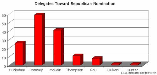 共和黨將選出至少2,380名代表,但如果該黨撤銷對懷俄明、新罕布什爾、密歇根、佛羅里達(dá)和南卡羅來納各州因安排在2月5日前舉行初選而實施的懲罰,代表人數(shù)就可能會多一些。目前這些州將失去一半代表名額。截至2008年1月,共和黨候選人需獲1,191名代表的支持才能贏得提名。