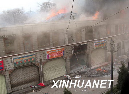 拉薩市小昭寺附近的商店正在燃燒。新華社記者 土登 攝