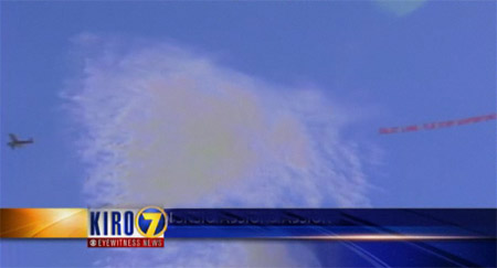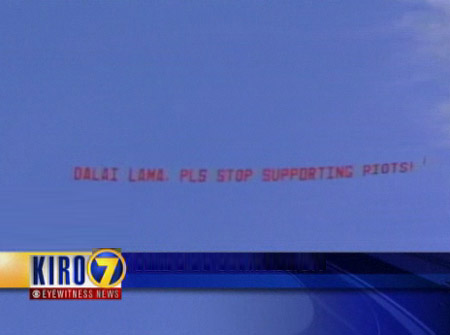 4月12日,達(dá)賴?yán)镌诿绹?guó)西雅圖演講,一架飛機(jī)拖著橫幅,上面用英文寫道:"Dalai Lama, PLS stop supporting riots!" (中文意思:“達(dá)賴?yán)铮?qǐng)停止支持暴亂!”)