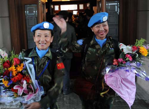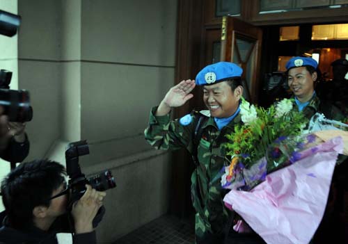 4月20日,兩名赴利比里亞執(zhí)行維和任務(wù)的醫(yī)療分隊(duì)隊(duì)員回到祖國。當(dāng)日,中國赴利比里亞第6批維和部隊(duì)官兵圓滿完成維和任務(wù),回到北京。中國第6批維和部隊(duì)是由北京軍區(qū)某集團(tuán)軍工兵分隊(duì)、某集團(tuán)軍運(yùn)輸分隊(duì)、254醫(yī)院醫(yī)療分隊(duì)組成,共558人。當(dāng)日先期回國的是其中的近300名隊(duì)員。