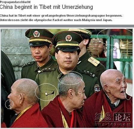 中國日報(bào)網(wǎng)環(huán)球在線消息:今年4月下旬,德國N24電視臺(tái)在其網(wǎng)站上發(fā)表一組題為“宣傳戰(zhàn)——中國在西藏開始思想改造運(yùn)動(dòng)”的新聞,刊登了一張中國警察和喇嘛在一起的照片,照片下寫道:“中國警察在北京監(jiān)視藏族喇嘛的儀式活動(dòng)”,網(wǎng)頁上注釋這張照片來自美聯(lián)社。一些專家認(rèn)為,這是一張幾年前的舊照片,而且這張照片是由兩幅以上的照片經(jīng)過技術(shù)處理合成的。