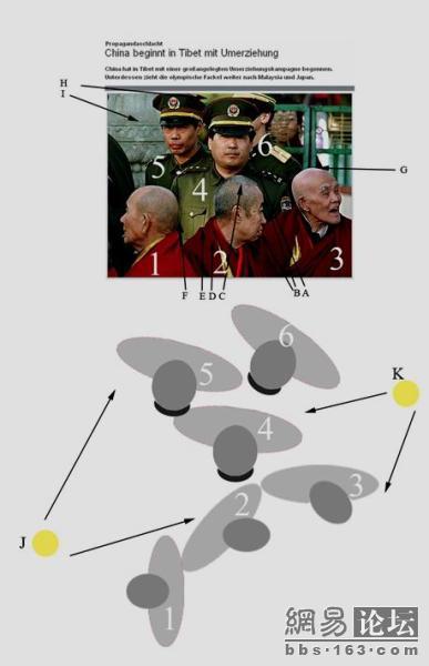 一、圖中人物2,3有來自于畫面右后方的側(cè)逆光光源照射(視圖標(biāo)k),故人物2的下嘴唇有高光點(diǎn)并在額頭有輪廓光(視圖標(biāo)B),人物3頭頂及后腦勺部有輪廓光。但分析圖片人物4,5,6其光源來自于畫左前方,如按光源k的光照方向,人物4的左側(cè)臉部與人物2的臉側(cè)部為同一受光面,故其左側(cè)臉部及左肩應(yīng)為亮部。但圖片中人物4的臉部及肩部均為背光面。人物4,5,6臉部光源來自于畫左前方(視圖標(biāo)J),其右胸部的受光面為光源直射區(qū)可以證明。