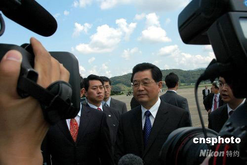 中國(guó)國(guó)家主席胡錦濤八月二十五日中午抵達(dá)韓國(guó)首都首爾,胡錦濤在機(jī)場(chǎng)對(duì)記者發(fā)表講話。中新社發(fā) 孫宇挺 攝