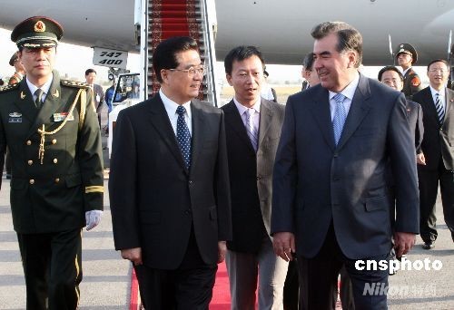 胡錦濤抵達(dá)塔吉克斯坦首都杜尚別,開始進(jìn)行國(guó)事訪問,并出席即將在杜尚別舉行的上海合作組織成員國(guó)元首理事會(huì)第八次會(huì)議。塔吉克斯坦總統(tǒng)拉赫蒙親自到機(jī)場(chǎng)迎接。中新社發(fā)齊彬 攝