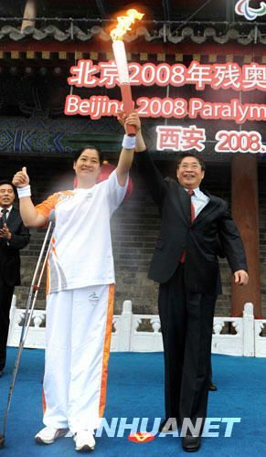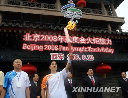 上午8時許,古城墻東門城樓旁的儀式現(xiàn)場已是熱鬧非凡。9時許,第一棒火炬手、殘疾人運(yùn)動員張輝從陜西省省長袁純清手中接過火炬。在眾人的歡呼聲中,殘奧會火炬接力拉開了帷幕。