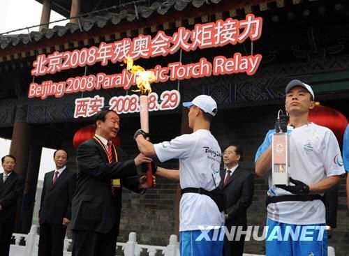 8月29日,北京奧組委執(zhí)行副主席蔣效愚(前左)接過火炬。當(dāng)日,北京殘奧會圣火在西安進(jìn)行傳遞。 新華社記者金良快攝
