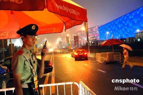 8月21日晚,武警戰(zhàn)士在“水立方”出口處執(zhí)勤。奧運(yùn)期間,北京武警總隊(duì)對(duì)奧運(yùn)場(chǎng)館積極采取有效措施,全力打造奧運(yùn)安保防線。中新社發(fā)楊慧峰 攝