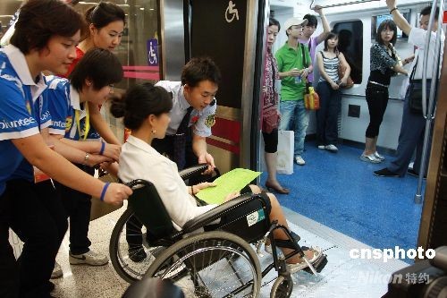 9月3日,在北京主要交通路口、地鐵站、郵局、旅游區(qū)和奧賽場(chǎng)館附近,隨處可見(jiàn)面帶笑容的志愿者們。這一天,是北京殘奧會(huì)志愿服務(wù)的行動(dòng)日。北京燈市口地鐵站點(diǎn)志愿者正在進(jìn)行殘奧會(huì)前的最后演練。殘奧會(huì)期間,乘坐輪椅的殘障人士如需坐地鐵,可提前打電話預(yù)約,到達(dá)地鐵站后有志愿者和工作人員提供一對(duì)一式服務(wù)。中新社發(fā)鄭雄增 攝