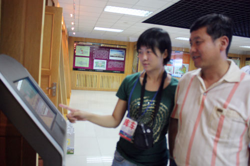 “2008網(wǎng)絡(luò)媒體聚焦烏洽會(huì)”采訪團(tuán)記者在查詢機(jī)前觀看伊寧概況。
