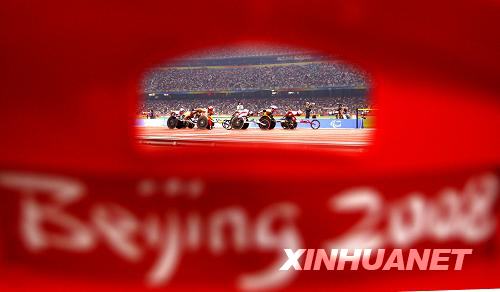 這是透過放置在國家體育場“鳥巢”賽道外的座椅靠背拍攝的奮勇爭先的田徑選手(9月14日攝)。新華社記者張燕輝攝