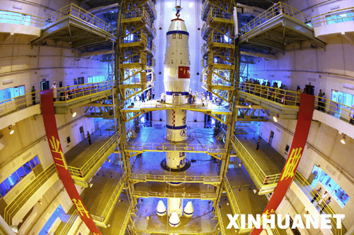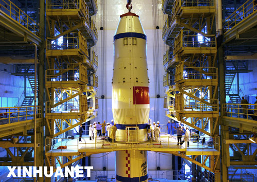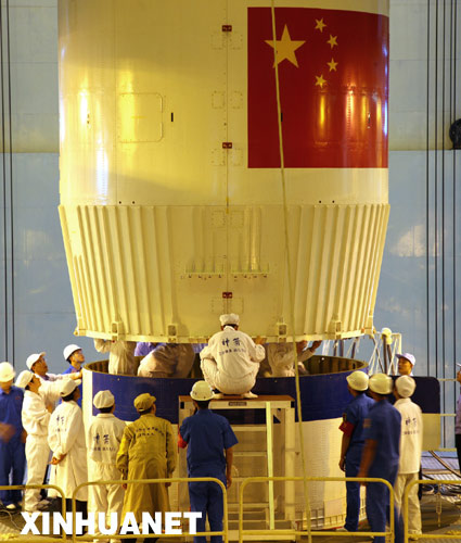 這是神舟七號飛船與長征二號F運載火箭在垂直裝配廠房進行對接。新華社發(fā)(秦憲安 攝)