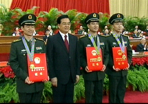 11月7日上午10點,慶祝神舟七號載人航天飛行圓滿成功大會在人民大會堂召開。胡錦濤親自為翟志剛、劉伯明、景海鵬頒發(fā)“航天功勛獎?wù)隆焙妥C書。