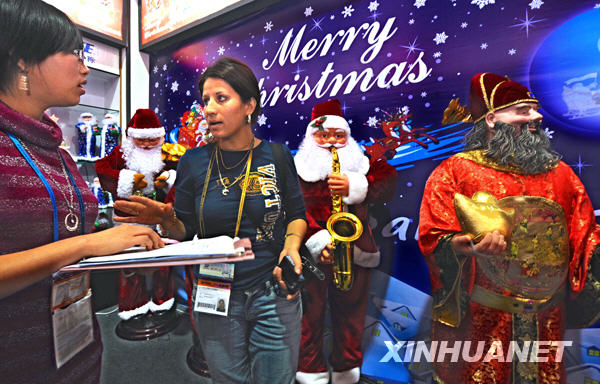 圖為10月24日,美國采購商喬安娜·科羅茲(右)在2008中國義烏國際小商品博覽會(huì)上與一位圣誕禮品經(jīng)營戶洽談購貨意向。新華社記者譚進(jìn)攝