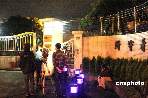 11月12日晨,陳水扁因貪污案被臺北地方法院裁定收押禁見,送往臺北看守所。圖為當(dāng)天入夜后,位于臺北縣土城市的臺北看守所門前,仍有大批媒體記者蹲守采訪陳水扁在看守所度過第一夜等相關(guān)新聞。中新社發(fā)黃少華 攝