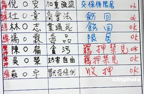 11月12日晨,陳水扁因貪污案被臺北地方法院裁定收押禁見。此案,創(chuàng)下臺灣前領(lǐng)導(dǎo)人被收押的首例,距陳水扁今年5月20日卸任不到半年。圖為陳水扁被裁定收押后,在臺北地院法警室看板上留下的記錄。中新社發(fā)黃少華 攝