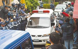 遭羈押因禁食而戒護(hù)送醫(yī)的陳水扁經(jīng)3天療養(yǎng)后,19日下午1點從板橋醫(yī)院還押臺北看守所,車道兩旁的媒體隔著大批維安警察搶拍救護(hù)車內(nèi)的阿扁。(王錦河攝)